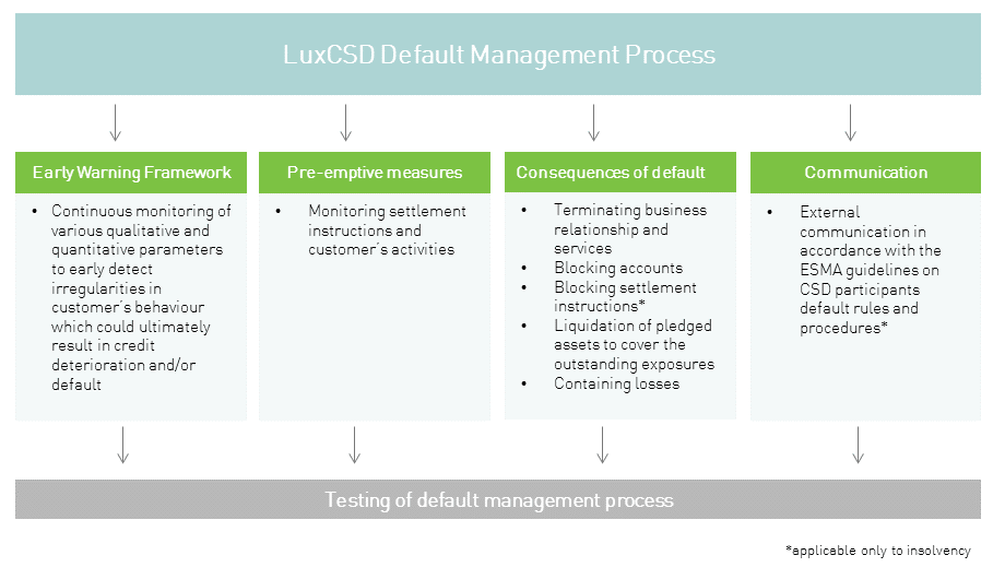 The default management process of LuxCSD has been implemented to mitigate the risks arising from the default of a LuxCSD customer and enables LuxCSD to avoid and minimise losses related to a customer default. The non-defaulting customers of LuxCSD also benefit from the default management process as its purpose is to manage a customer default in a prudent and orderly manner, limiting disruptions to the market and avoiding changes to the normal settlement practices of non-defaulting LuxCSD customers.